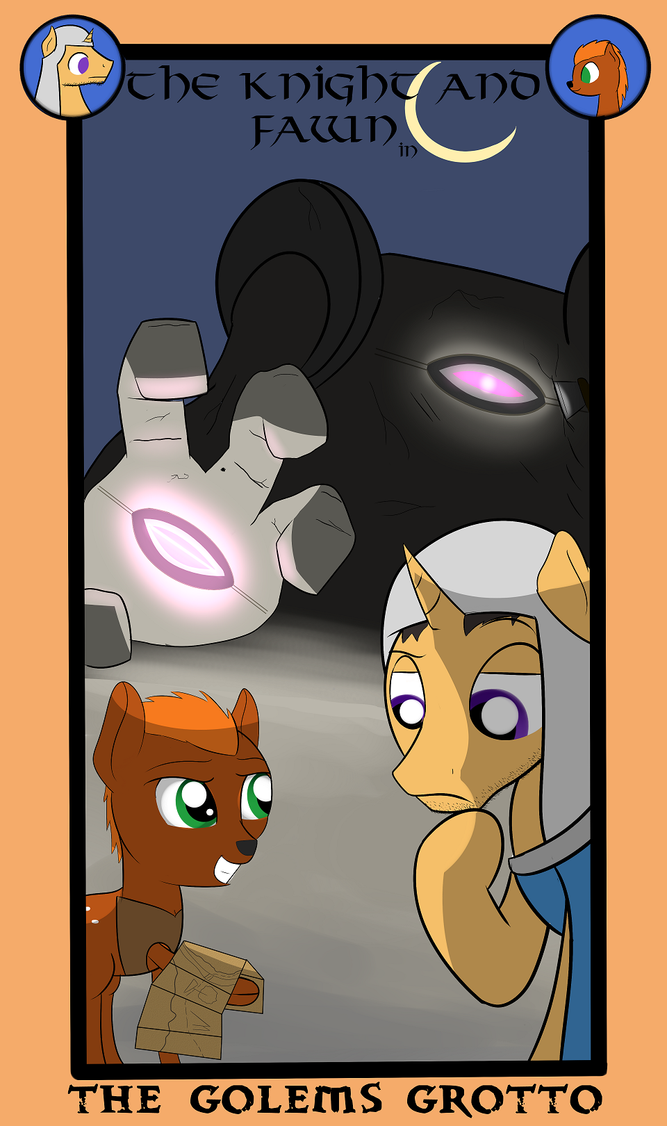 “Not one inkling, young fawn,” said the knight, flinching as harmless remnants of the golem bounced off his crumpled armor. He took the time to inspect his injuries. Some cuts form his armor, and bruising where the golem had him in its grip, but nothing terrible.