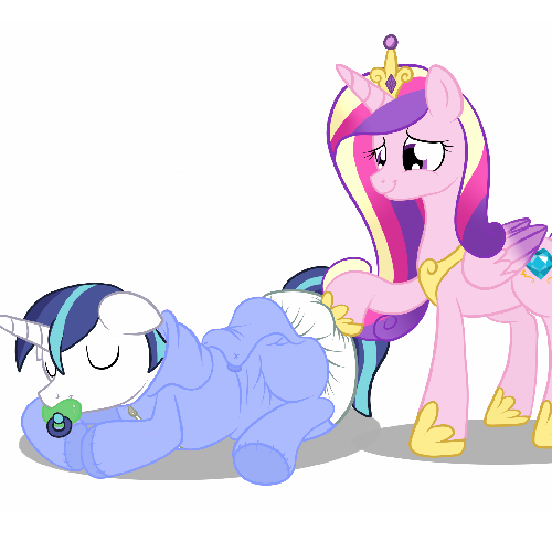I then turned to Shining Armor who was still on his back on the bed, looking up at me from between his legs. "And don't think I forgot about you, little colty!" I smiled at the white unicorn. He looked up at me with embarrassed eyes, which only seemed cuter with a fresh diaper crinkling around his waist. A strong stallion like Shiny looked so adorable in his diapers. There was something special about a big tough guy being brought down with an embarrassing diaper around his waist. I suppose I have a weak spot for that kind of stuff.