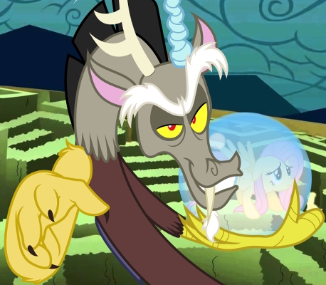 With a dramatic wave of his other paw and a turn on his goat leg's heel, he summoned an enchanted crystal ball that floated in the air and reflected Fluttershy's image as she navigated the labyrinth. Angel tried to squeeze through Discord's claws to get a better look, crying out for her.