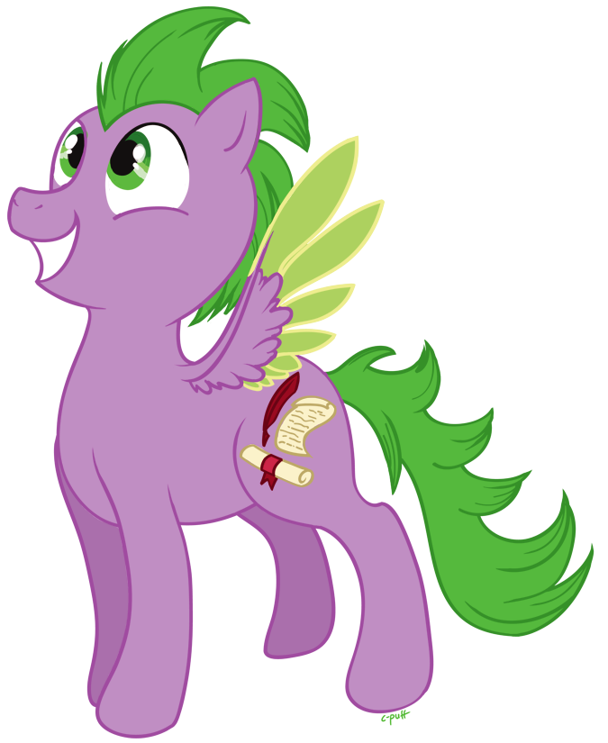 Zecora said nothing, only held up a mirror. Spike took a look at his new form; he was now a pony, a pegasus at that. His coat was the same purple his scales used to be but instead of his green spikes, he had the same shade of green but as a mane and tail, even the tips of the feathers of his wings had some green on them. His cutie mark was a scroll with a red feather.