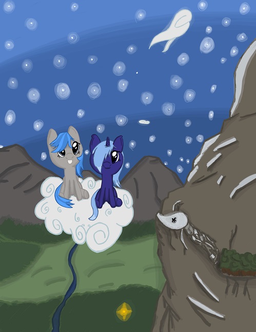 But Cloudy could. She could see her little town, sitting upon the very edge of a cliff and surrounded by trees, she could see the dense forest stretching all the way to the horizon, and she could see the pale light of the moon reflecting on other clouds that floated with her in the starlit sky. All of this was encompassed in the colossal valley that spanned between the great mounds of rock that made up most of northern Equestria, a beautiful sight for anyone as high up as Cloudy.