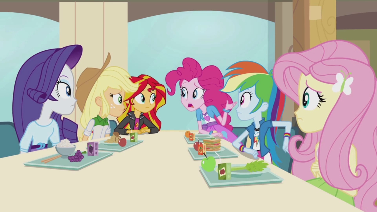 Chapters Canterlot High during lunch was, perhaps, the busiest time of the day for all of the students there. Everyone would get together and enjoy each other's company, get involved in their little cliques, or just work out their plans for the upcoming weekend. Today was no exception, as the air was abuzz with the voices of hundreds of teenagers and pre-teens going about their business. At one table in particular was a group of girls that had earned quite a reputation for themselves. A group that had been named the "Rainbooms", after the band they'd formed in a recent music competition the school had hosted.