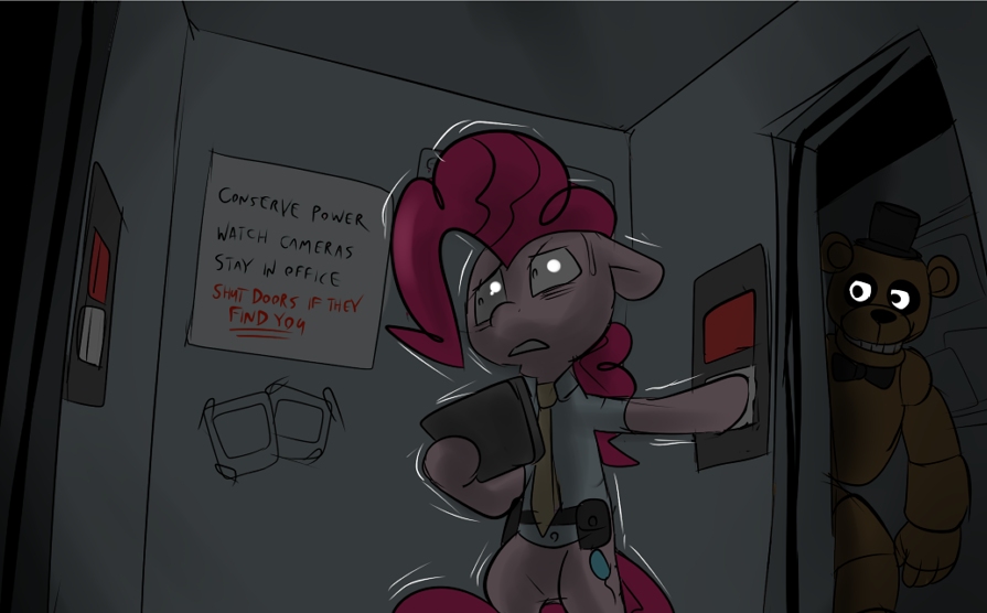 The rest of the night went by uneventfully. Pinkie was introduced to everypony in the restaurant, got a very detailed course on how to properly use the security system at the pizzeria, and was given her uniform. She did ask at least six times why the security office had a pair of hydraulically controlled blast doors seemingly thick enough to stop a direct magical attack, to which Mr. Faz said: “Oh, we had a bit of a break-in some years ago. Our previous night-guard, who was a wiz when it came to mechanics, installed them to make sure he had a nice and safe location to call the authorities from. In fact, he was the one to give our beloved animatronics their most recent upgrade.”