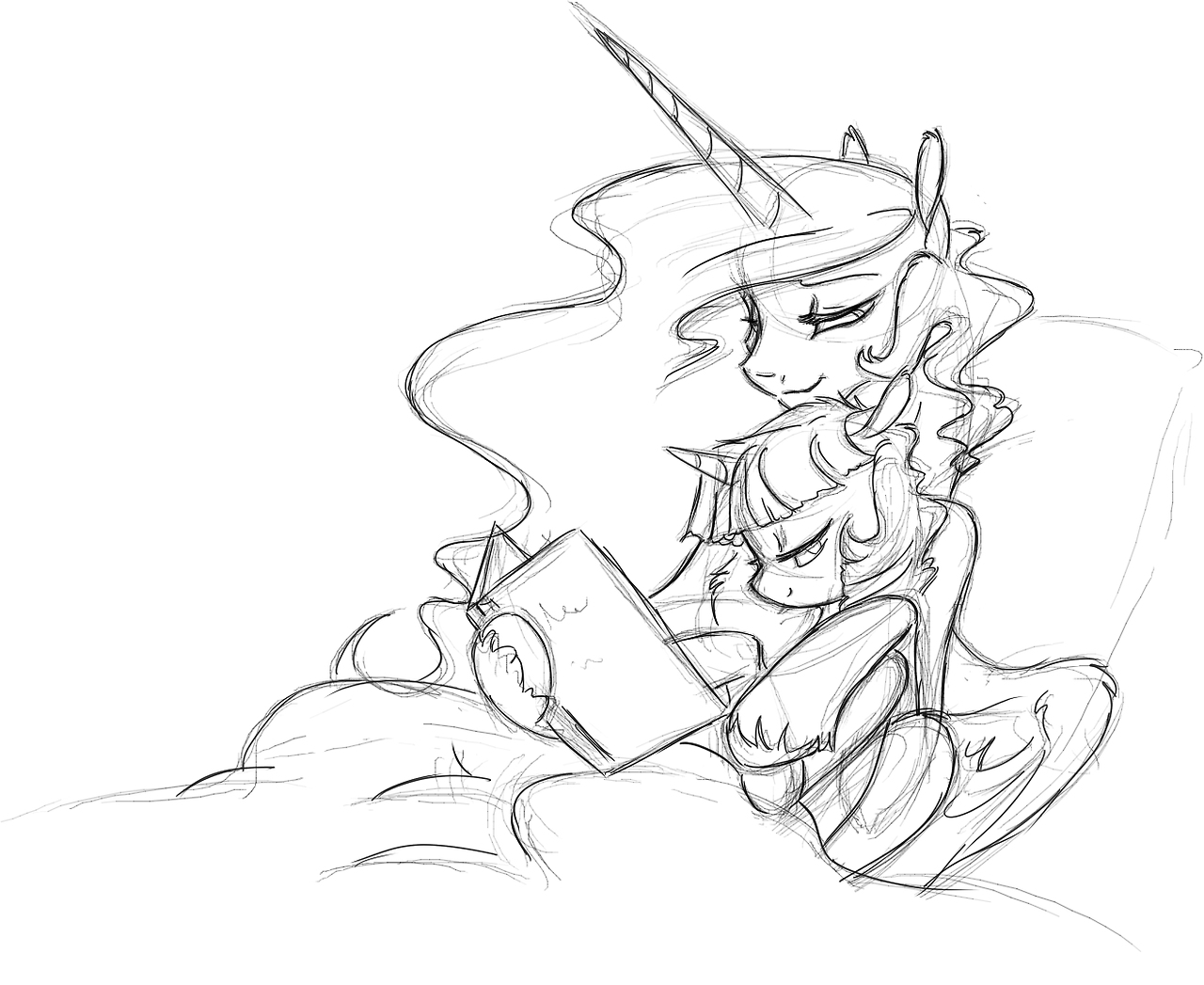 Twilight was so absorbed in her book, she didn't even notice the princess had approached her and now hovered above her, curiously reading over her shoulder. It wasn't until Celestia spoke up that she finally reacted, looking up and blushing, no doubt embarrassed at having been discovered.