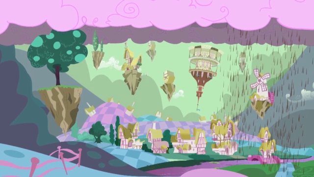 Suddenly, the sky darkened, countless pink cotton candy clouds came in over the skies of Sweet Apple Acres. With them came the brown rain, soaking the fields. Following behind them, was a frustrated Rainbow Dash.