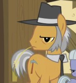 “Coming!” Pinkie exclaimed loud enough that it would carry into the storefront. She hopped through a set of wooden swing doors and stopped in mid-air, defying gravity as she looked at the pony that stood in front of her. Instead of continuing in her arcing trajectory she fell straight down and her pupils shrunk to the size of raisins. Pinkie gasped loudly, but not like she had when she first met Twilight Sparkle, this was a gasp of horror. Standing in the storefront was an earth-tone pony with a dark Stetson hat and a pick-axe for a cutie mark. He had long sideburns and his mane and tail were both striped with the same two shades of gray. The familiar pony glared back at her with fiery yellow eyes.