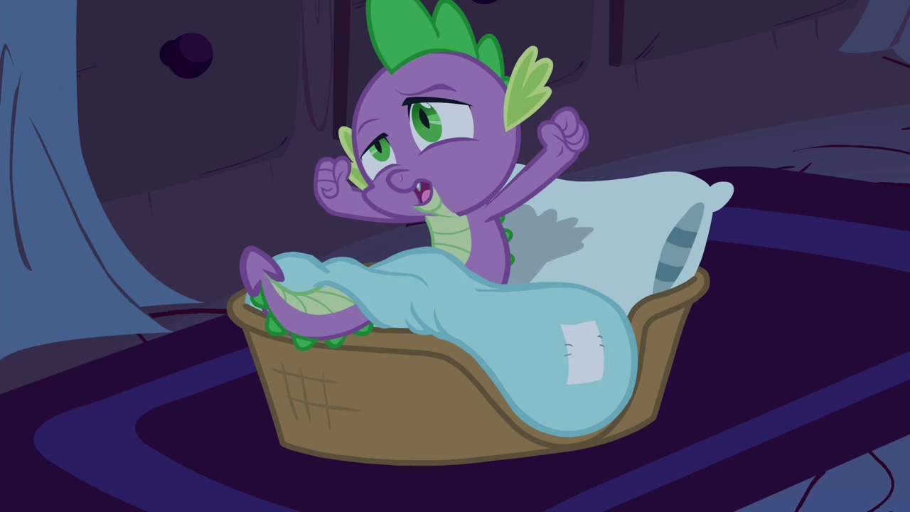 Morning had arrived in Ponyville, and the residents of the town were starting their day happy and rested after a long night's sleep. In the Golden Oak's Library, Twilight Sparkle had finished her study session and was now making her way up to her and Spike's bedroom. Opening the door, she entered with a cheery look on her face. Unbeknownst to her, Spike, who was lying with his face pointed away from her, had his eyes wide open, and the dark rings under his eyes made it clear that he had not one moment of sleep last night. However, not realising this, Twilight walked beside his bed and gently nudged him with her hoof.