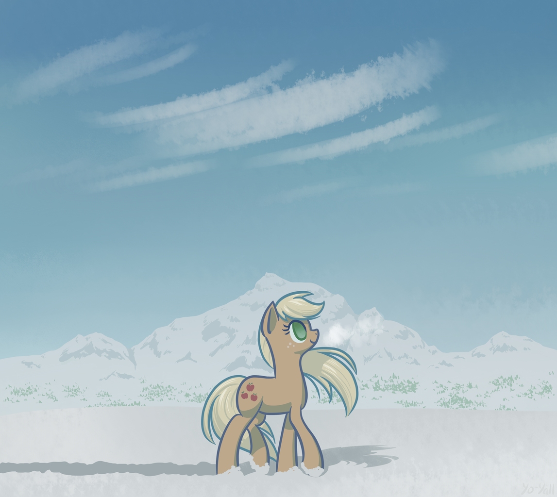 Before Applejack was a large field, blanketed by snow. Completely untouched by the paths of any animal, it looked like a large white sea in a dead calm. The field was backed by a similarly-snow covered mountains, which jutted out of the landscape like large, white teeth.