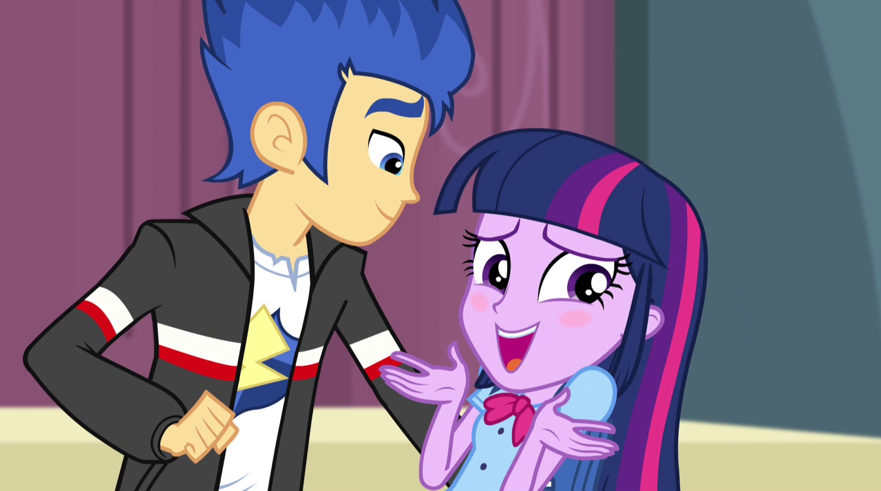 Leaning into her companion's arm, Twilight let out a relaxed sight as they strolled together, Flash smiling down at her as they moved. However, as they neared the locker area of the main hallway, his expression become a somewhat nervous one as he stopped suddenly. This alerted Twilight as she finally opened her eyes, looked up and immediately took note of the look on Flash's face. Sensing that something was wrong, she spoke up.