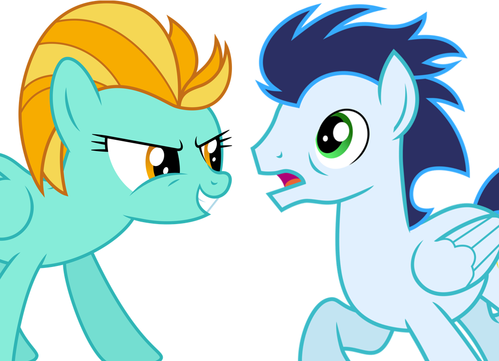 The two stared into each other’s eyes for an uncomfortable length of time. Lightning Dust held a dominating, lecherous grin while Soarin scrunched his muzzle, glancing up and down her body anxiously.