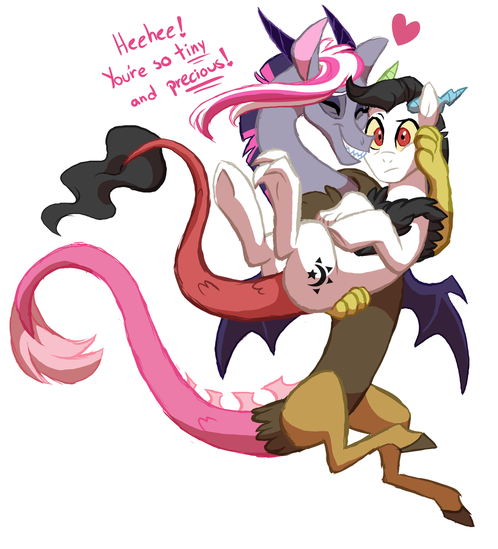 “Hey! What on--” Illusion found himself squirming helplessly, the height difference between himself and the new draconequus actually allowing her to pick him up like a foal. It was rare that illusion found himself truly embarrassed, but today looked like one of those days.