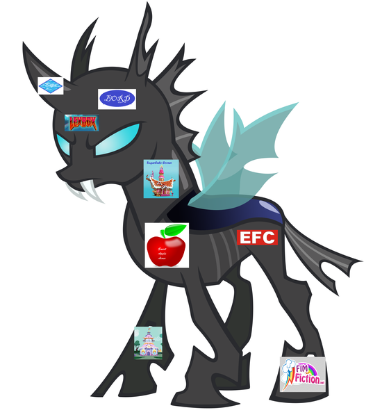 There was another changeling in the skies. Her coat had the letters EFC on one side, and Equestrian Fried Churros on the other.