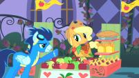 In an effort to take his mind off his hunger, Soarin had trotted out of the dance hall and toward the Wonderbolts VIP section. While taking in the sights, he had frozen when his eyes beheld, of all things, a stand that looked to be filled to the brim with food, though instead of the usual hors d'oeuvres, this small establishment seemed to be offering a much more filling and satisfying selection of treats. To his surprise, though, it was not the food that captured his attention most of all, but rather the stunning orange mare that stood behind the counter. Her magnificent green eyes flickered around the crowd of ponies eagerly, and beneath her wavy blonde mane with the adorable pigtail, she wore a smile that looked more genuine than any he had seen on the faces of the snobby Gala-goers that night. And her dress! It was a marvelous garment, evoking the sense of a hard-working farmer while at the same time accentuating her toned body; it was a simple get-up, but it truly drew out the mare's natural beauty. Soarin's heart was in his throat, even as he put on a front of bravado when he approached the stand and ordered one “big apple pie.” He desperately wanted to say something, anything more, but instead, his nerves got the better of him, and he walked off, the delicious sugary pastry clutched in his mouth while his spirits sank rapidly.