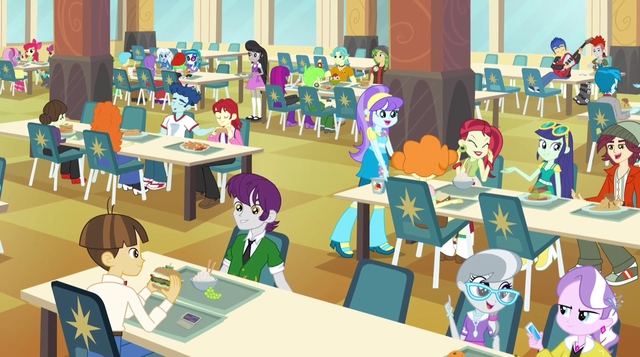Flash gave a sigh and a nod, acknowledging his companions words, before getting back to his meal. As time passed on, he glanced up from his food to observe some of his other eating buddies, such as Bulk and Big Macintosh, both of whom were competing against one another to try and see who could eat their meal the fastest. Naturally, this led to several bouts of gagging soon afterwards, which Flash couldn't help but chuckle at. On the other side of the table thought was a more quiet lad. Random Insert, noteworthy perhaps for his friendship to the school's local heroines, the Rainbooms, as well as his current relationship to one of their former adversaries, Sonata Dusk. As for Vanidicus, he was perhaps the strangest of them. Much like the Dazzlings, he too was a native of that other world, Equestria. A creature known as a Changeling, at least back then. Now, he was human like the rest of them. Chucking to himself after considering his current colleagues, Flash took another bite of his food, after which he was distracted by a sudden beeping sound. Looking up, he saw that it was Randy's phone, which he just now pulled out of his pocket to look at. A smile formed on the boy's face, leading to Flash raising an eyebrow at him.