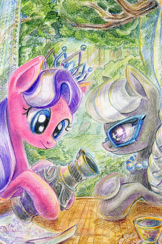 Silver Spoon held a hoof to her mouth as she giggled. Diamond Tiara was always fun when she was tipsy.