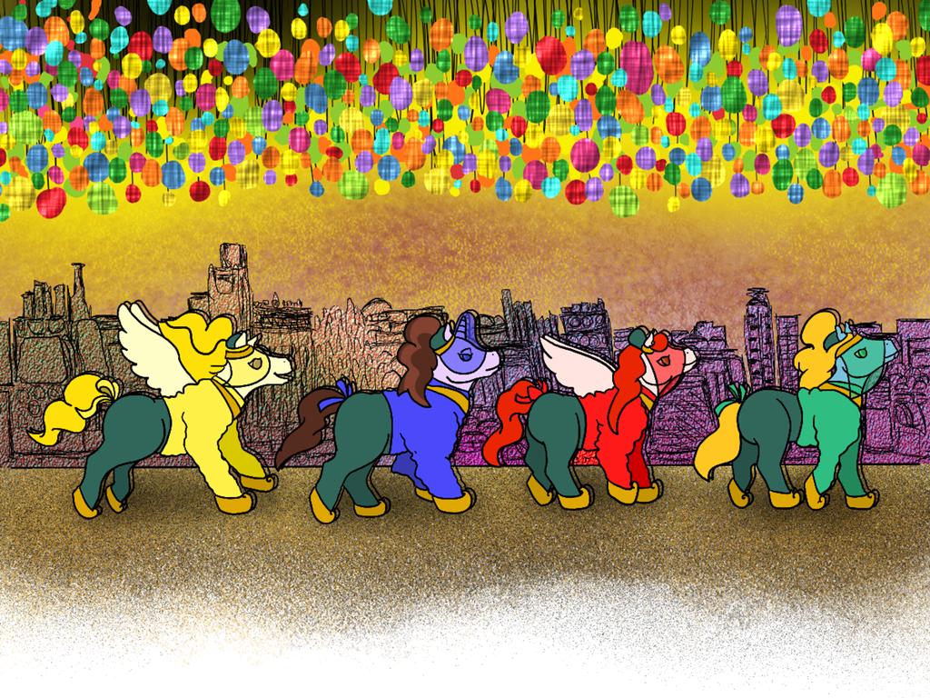 The four mares trotted off the boat, arriving in a city filled with light, sounds, and color. Ridejah- the great capital of the Saddle Arabian Sultanate, and the very center of their nomadic desert culture. Minarets and great domes rose over the landscape before them, with row after row flat-roofed houses lining every street. As the ponies trotted farther in from the docks, they notices hundreds of horses of both sexes trotting about the streets wearing ornately decorated saddles and reins; the males also in a fez , the females wearing colored translucent veils. It looked like something out of an enchanted fairy tale to the four Ponylanders.