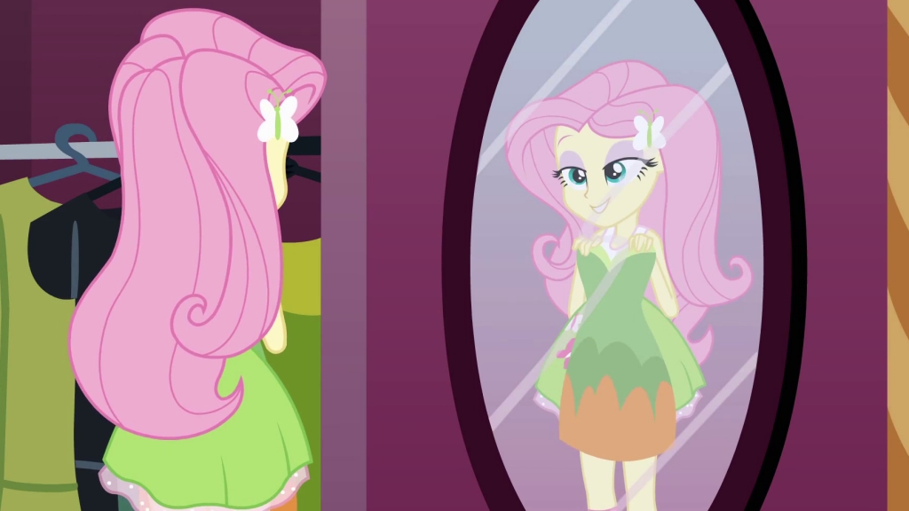 Fluttershy tried to maneuver around Sunset Shimmer to see her reflection in the mirror.
