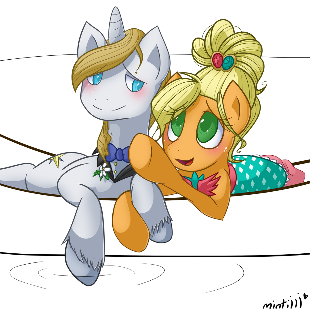 Prince Blueblood smile and softly kissed Applejack's cheek. Applejack felt herself blush at the touch of Prince Blueblood's lips.