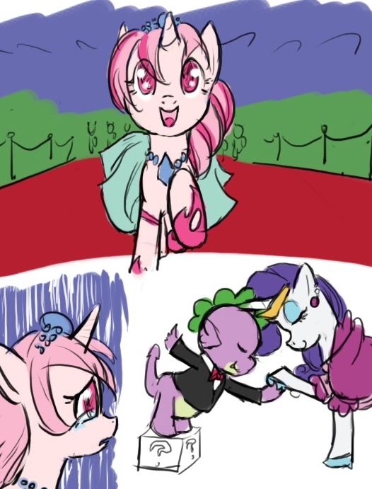 Spike, in all his handsomeness. I saw him exit a carriage. His small size resulted in someone to get a wooden block for him to step onto in order to get off. I got over to see if I could help him down, only to find that someone else had helped him down. A white unicorn with a purple, curly mane. I had never seen her before in my life, but she seemed more fancier than any pony I had ever danced with during my practice. Did she have any relations to the Princess? Where did she come from? Anything in my mind revolving around this new mare was shattered with one single phrase.
