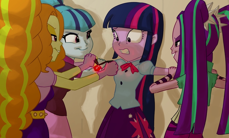 Immediately, Twilight rushed forward, trying to get to the door again, but it was too late, for Aria and Sonata then sprung into action, with the former grabbing onto her left arm while the latter grabbed her right. With an almighty push, they forced her against the wall, and no matter how hard she struggled, she couldn't get out of their grip. At first, she considered screaming for help, but that plan soon faded from her mind when she realised, to her fear, that at this time on day there would be nobody left in the school. Nevertheless, she kept trying to break free, and through her attempts, she glared angrily at Adagio.