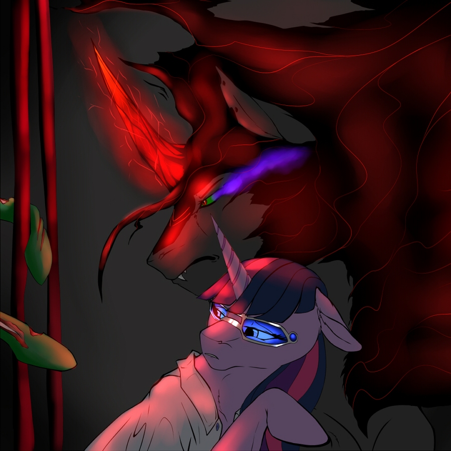 "That is my mane you're touching, mare." Twilight's breath hitched in her throat and she whipped around to see a set of red and green eyes seemingly floating among the glowing veins and darkness. They watched her with a feeling of pure anger and malice so permeable that it hit her like waves crashing against the shore of a beach. She took a visible step back...