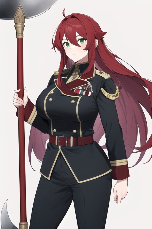 The light faded revealing Sunset now wore what looks to be a military uniform. A thigh length grey coat and matching pants with red and yellow highlights. She had on red tinted armor, gauntlets, boots, a metal chest plate and what looks like metal wings on her back. She wore a helmet in the shape of a unicorn with a glowing horn, in the place of the crown. She held a battle axe, its the length of her body and has a massive blade on it that run down about half the staff that it's attached to. That blade is attached to staff by thick metal clips that held the blade in place, while letting Sunset grasp it and use it like a staff if she needed to. (1)