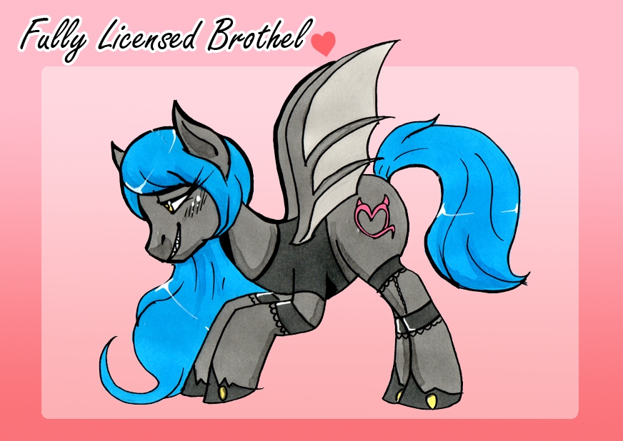 "Welcome." Called a voice that nearly stopped your heart from its direct, yet sweet sound. Entering the room, you see the grey batmare you paid for. Looking her over, you can see her chest area, along with parts of her arms, legs, and hooves are covered in black latex. Her devil horn, heart shaped cutie mark. And the whips at her sides only add to her dominating look. "My name is Mistress, thank you for selecting me." Her smile is devious, yet almost innocent. "How would you like me to serve you?" Turning around, Mistress swishes her blue tail back and forth, giving small hint peeks at her grey horse pussy. "I can be the submissive slut of your dreams. What would you like?"