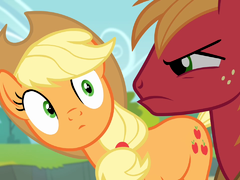 Apple Bloom sidled up closer to Big Mac, trying to interpose herself between her brother and her sister. "Now hold on, Applejack. Big Mac's a good brother! He's always around when I need him, and he's so big and strong..."