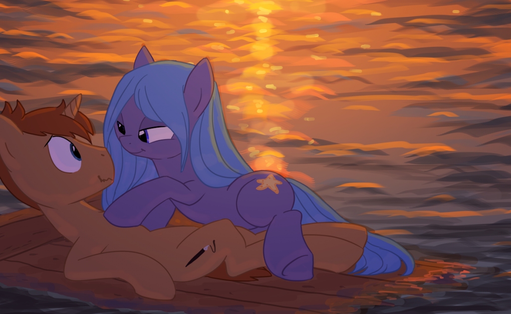 The stallion’s eyes widened at that, and his head snapped around. Just as she’d said, there it was, their ship, splintered, shattered, and sinking fast. He couldn’t see any other ponies besides themselves, and soon he wouldn’t be able to see anything, for the sun was setting fast, bathing the waters in a warm orange glow. To say that the stallion was unhappy about all this would have been an understatement, as he let out a grunt of annoyance at it all. As for the mare, she just kept on smiling at him.