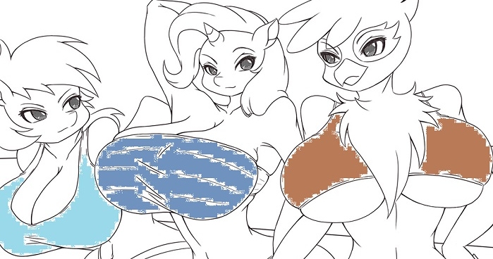 Looking at the three sexy mares and griffon, I saw all three were topless, their massive breasts were swaying and bouncing hypnotically. And their bottoms.....my brain stopped working for a second. All three of them were wearing the thinnest and tightest looking thongs I've ever seen. And what made me really stop thinking for a second was that each one of their thongs looked like they belonged on the other one. Trixie was wearing Gilda's, Gilda was wearing Rainbow's, and Rainbow was wearing Trixie's. When did they have the time to do that?