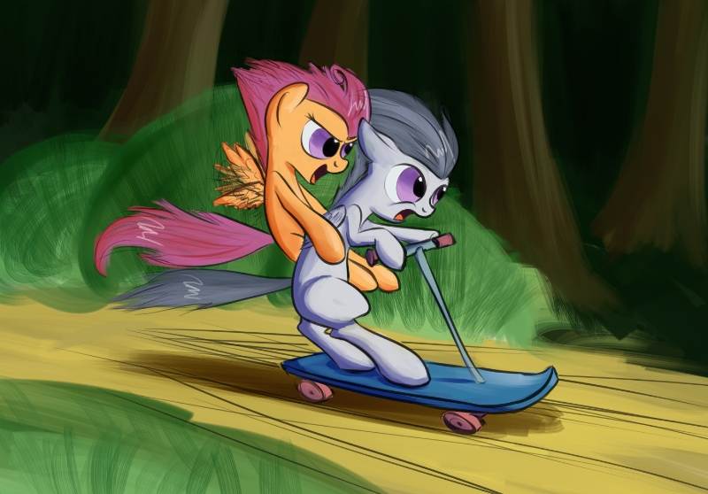 “Sup,” was the casual reply. Scootaloo seemed more interested in fixing her short purple hair. A hard stare from her teacher prompted her to continue. “Heya Rumble. I’m Scootaloo –most fastest and awesomest filly on four wheels around here!”