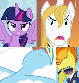 Rainbow Dash weakly struggled in Twilight's embrace. "Oww! Weren't the charges dropped? Why are you trying to crush me to death?"