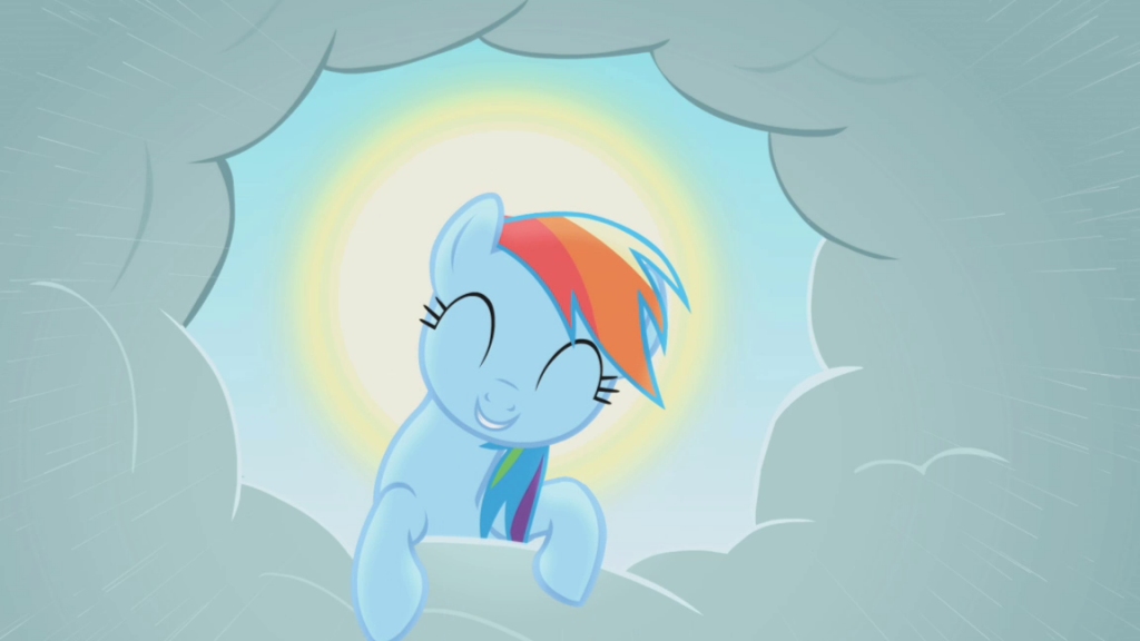 Rainbow then flew off, leaving her hole in the clouds completely empty, much to the confusion and worry of the humans below. It didn't take her long to reach Twilight, and when she did, she was wearing a massive grin.