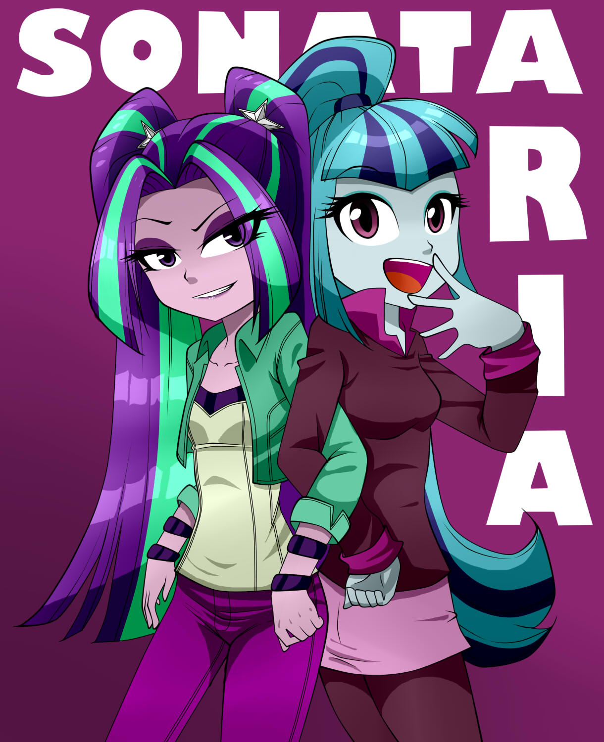 The applause began again, and then Aria saw her. Sonata stepped out from the left side of the stage, stepping up next to Sunset at the backup microphone, hands folded in front of her. Aria noticed the applause die down a bit, and she overheard hushed voices in the audience, such as "What's she doing here?" and "What's going on?"