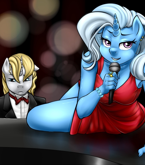 She leaned a little closer. She came up only to his shoulders, but could tell from the look in his eyes that he was deeply focused on her—or, at least, on her chest. She pushed her torso forward, not overtly, but enough to make it clear just how much her breasts strained against the fabric of her dress. Blueblood’s eyebrows went up, and he eyed her bust hungrily. “Really?” Trixie murmured, placing a hand on his chest and letting her bra-less nipples brush against his shirt. “Because I seem to remember a very handsome stallion spending the evening just hours ago.”
