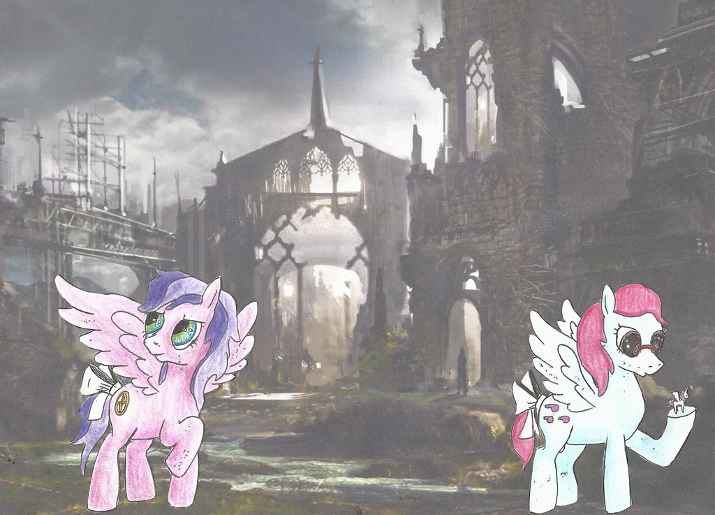 "Be cautious on your approach, North Star. These rocky outcroppings can be most hazardous." Wind Whistler warns me, as she came in for a landing on one of the ruined streets. Nodding, I gently come in for a soft landing, my hooves clacking on the cracked cobblestone road. This whole city was built directly into the cliff side, and it is a miracle it has not yet slipped down the mountain, and crumbled away into dust. It is truly a testament to to the ability and know-how of the ancient Equestrian Ponies, those wondrous Ponies of an an advanced and peaceful era. Oh, how different their world was, from the world we live in now!
