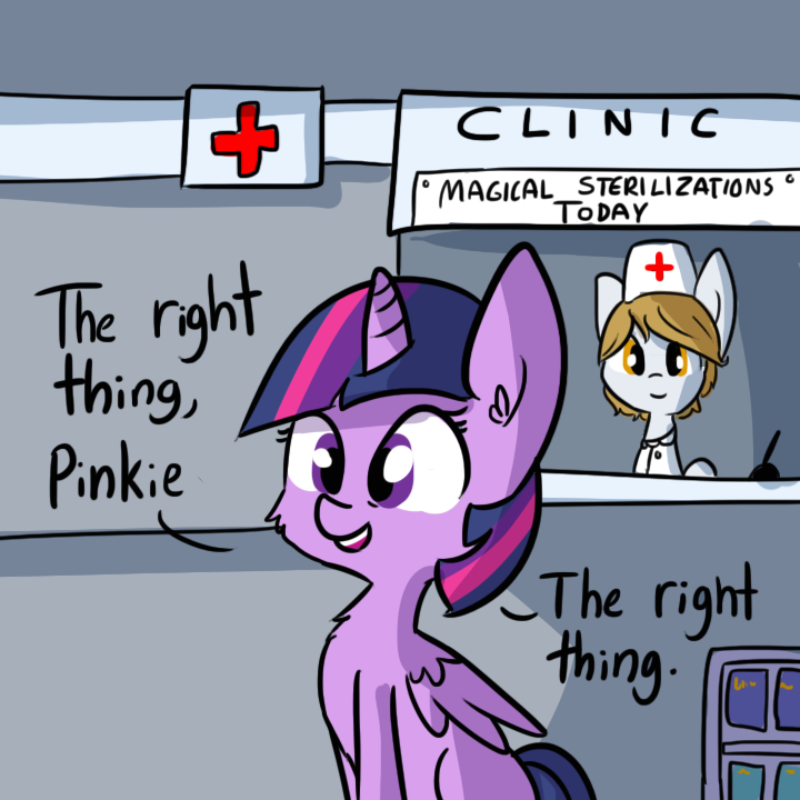 “You wanted to adopt because you regretted your decision to make yourself sterile after seeing how Princess Flurry Heart turned out and you didn’t want your foals to come out like her, right? Right? Right?” Pinkie Pie booped her snout right at Twilight’s. She was so close, Pinkie could see the tears coming from her eyes.