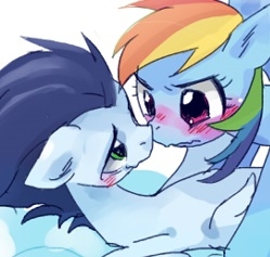 They both shared a chuckle, the discomfort from before all but forgotten as they chatted on the couch. Rainbow’s impish grin faded as a more serious expression took its place, one that Soarin was about to question about before the mare beat him to the punch. “Just, uh, if we do, uh… get together...“ - their eyes separated for a moment as matching blushes grew on their faces before Rainbow resolutely brought hers back to him - “I don’t want to get into the Wonderbolts just cause… you know. Relationships. I wanna EARN my way in.”
