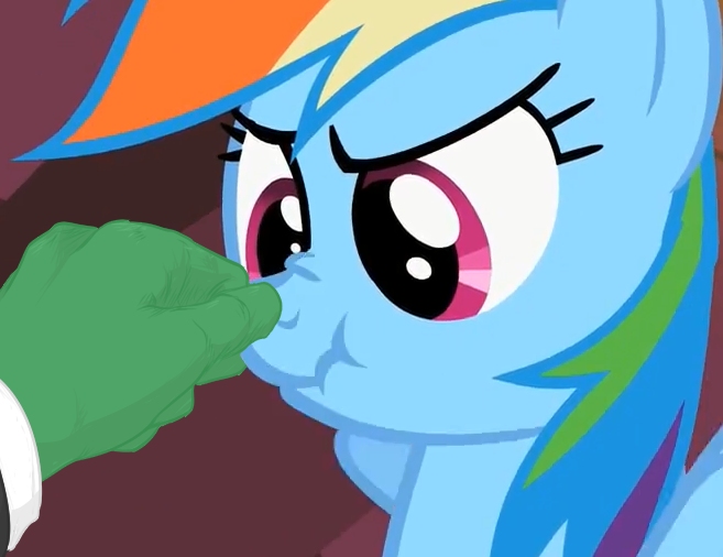 Here you reach down and firmly but gently press your index finger directly into Rainbow Dash’s nose. Her nose compresses slightly, wrinkling at the bridge, and you can’t help but let out an audible “boop!” as you do this. Rainbow goes briefly crosseyed, glaring intensely down at your finger. She briefly looks like a confused and angry little bunny, the way her cheeks puff out and her neck cringes back.