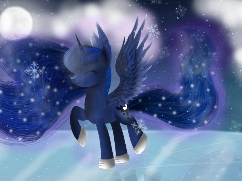 Luna hooves slid across the frozen pound, guided by a simple magic spell she was casting from her horn. She let out a joyful laugh as she jumped into the air and did a spin landing on her right hind leg. She just barely recovered thanks to her wings, saving herself from face-planting into the ice.