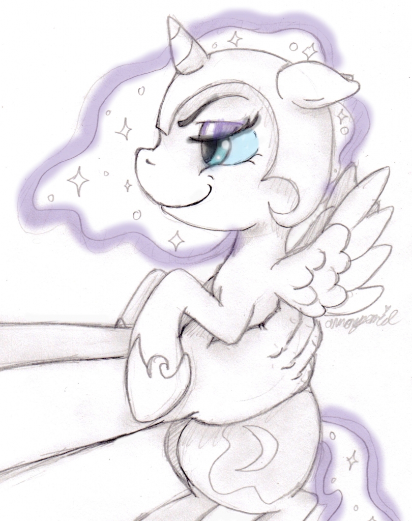 It’s been almost half an hour before you hear from Moonie again. You’re just sitting down to read one of those idiotic fashion magazines Rarity gave to you, when you hear a call from the guest bedroom.