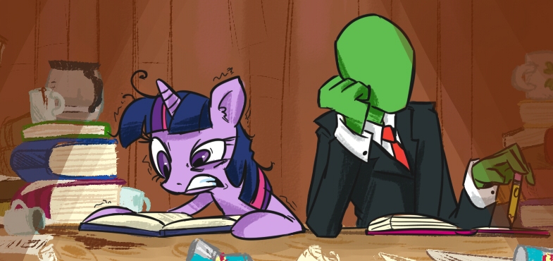 "Uh, you know Twilight," Spike nervously speaks up before pausing. He hesitates but when you make eye contact, he continues, "I'm not so sure he's dangerous. Anon has been in town for a while now and hasn't hurt a fly, not to mention that time your magic spooked him, he took Applebloom to safety."