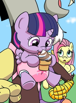 Everypony glanced at Discord as he tickled the foal. Fluttershy strolled over to his side and smiled. “It was Discord’s Idea to turn her into a filly to help her relax until the end of the day..” Everyone in the room nodded understanding what was going on. Twilight finally managed to get her laughing fit under control and sucked her paci.