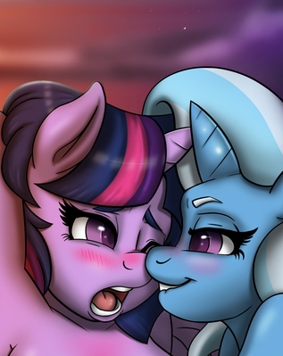 Perfect. Trixie’s grin widened. Just where she wanted her. With a perky growl, she pounced on Twilight, catching the busty alicorn in a kiss and sharing the taste of her own musk. Twilight accepted the kiss greedily, their bodies grinding heavily together as Trixie’s growls grew deeper.