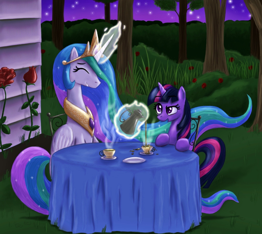 In all their private talks and get-togethers, rare though they had become since Twilight's ascension, a tea set and some form of tea had been constants. Twilight had been so excited, brimming with fillyish giddiness that morning at the thought of spending time with Celestia, even though she was Very Much a Grown Up Princess Herself and should be past such things. She had pranced through the streets of Canterlot on the way to the palace, for pony's sake! The promise of tea and tea sets and chess was just more than she could resist.