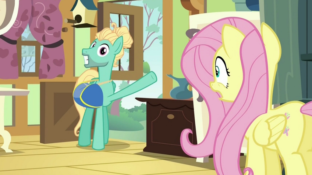 Still smiling at the unbelievable turnaround from her notoriously idle sibling, Fluttershy flew over to answer it, and with her eyes still locked on him in a rush of familial pride, she didn't see who it was at first.