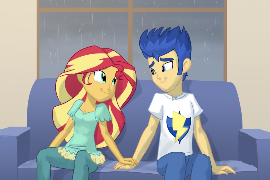 The two simply sat upon the sofa, staring out of the window on the opposite side of the apartment. As Sunset and Flash stayed together like this, neither of them said a word, merely counting the moments as they passed by. One would look at this image, and could not help but think the word "awkward". Nothing but silence, for minute after minute, broken only when Flash, after letting out an exasperated sigh, spoke up.