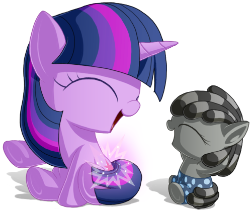 Her mother introduced us. When I first met Twilight she was still very young. She was still in diapers, but that was okay, I liked her anyway. I was still excited to meet her. I practically jumped out of her mother's hooves. Twilight gave me a big hug as soon as we met. She didn't say anything. She was still too young to speak words. But she didn't have to. Her hug told me everything I needed to know.