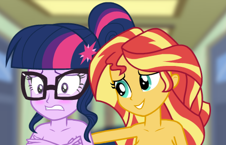“Just relax, Twilight!” Sunset urged, gently taking hold of Twilight’s arm that had risen to conceal her exposed nipples and easing it back down. “And try not to cover yourself like that. It’s considered rude here and will only draw attention to you. People are going to start thinking you’re Fluttershy’s long lost sister or something with that kind of shyness.”