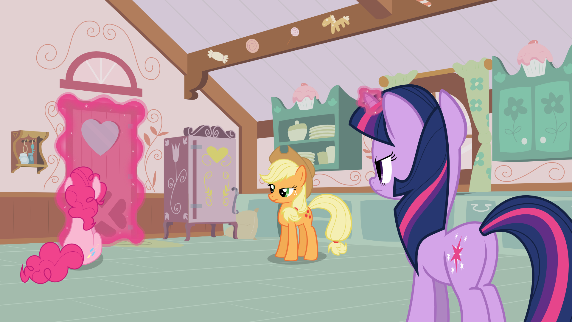 "Well, that went well," Applejack said as she helped Twilight back to her hooves. "What do we do now? We gotta get Pinkie to forget about that door!"